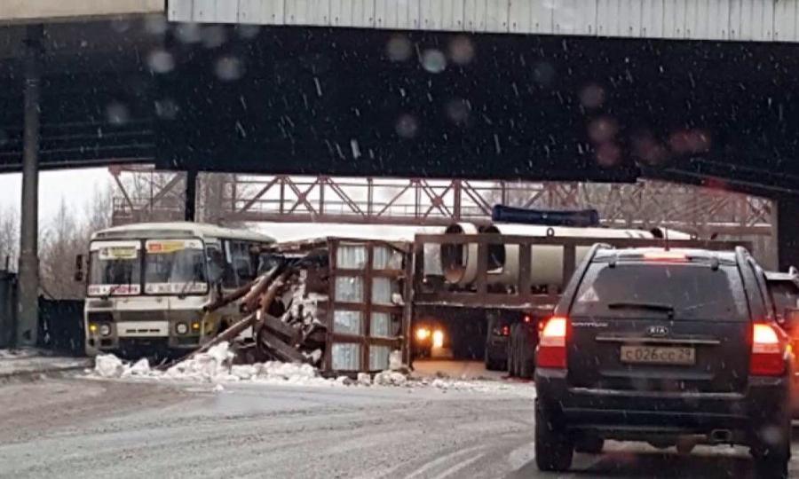 По информации городской ГИБДД, водитель тягача не справился с управлением, и при повороте груз упал на проезжую часть. Контейнер задел легковой автомобиль и автобус 4 маршрута. По предварительным данным, пострадавших нет.