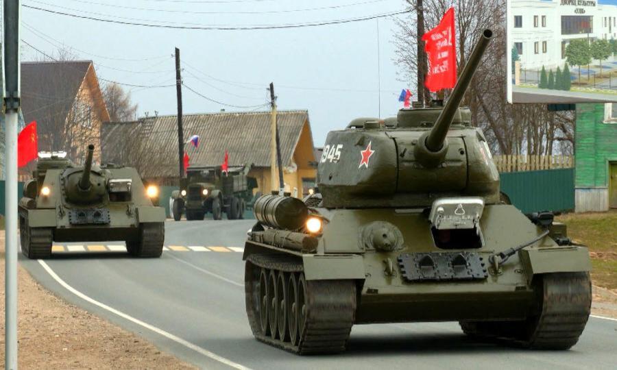 Танк Т-34, самоходная артиллерийская установка, «Катюша», гаубица — колонна из 10 единиц уже проехала от сёл Шангалы и Березник до посёлка Октябрьский. 9 мая колонна проедет по центральным улицам районного центра. Вся техника приобретена для военного музея Устьянского района.