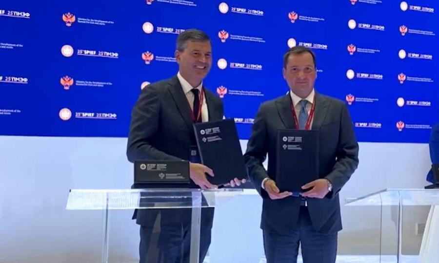 Уже в третий день работы форума было заключено четырехстороннее соглашение. Архангельская область, Минвостокразвития России, Корпорация развития Дальнего Востока и Архангельский ЦБК закрепили намерения о стратегическом партнерстве. Оно направлено на модернизацию производства комбината. Объем инвестиций по проекту газификации АЦБК составит больше 11 миллиардов рублей. Планируется, что на голубое топливо АЦБК перейдёт в 2029 году. Продолжится сотрудничество и с "Почта Банком". Сегодня он обеспечивает доступность финансовых услуг в 275 населенных пунктах региона. С банком достигнута договоренность о совместной реализации социальных программ, в том числе, проекта "Пушкинская карта".
