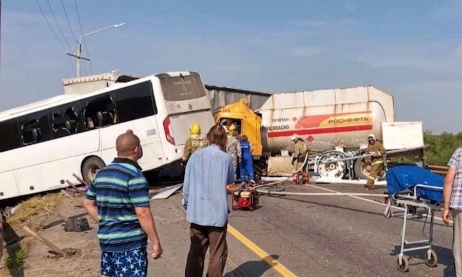 В Котласском округе столкнулись грузовик и автомобиль-газовоз. Еще одним участником ДТП стал автобус — уходя от столкновения он съехал в кювет. Предварительно, водитель фуры, двигаясь в сторону Котласа, выехал на встречную полосу, где столкнулся с газовозом. Водитель погиб на месте, еще 15 человек пострадали. Четверо доставлены в Котласскую ЦРБ, в том числе рулевой газовоза — он в тяжелом состоянии в реанимации. Один из пассажиров оказался зажатым в автомобиле, ему понадобилась помощь спасателей. В автобусе ехали призывники, у них ушибы и ссадины. Газовоз был заполнен топливом, разгерметизации емкости не произошло. Причины ДТП выясняют сотрудники полиции. На месте ЧП образовалась многокилометровая пробка.