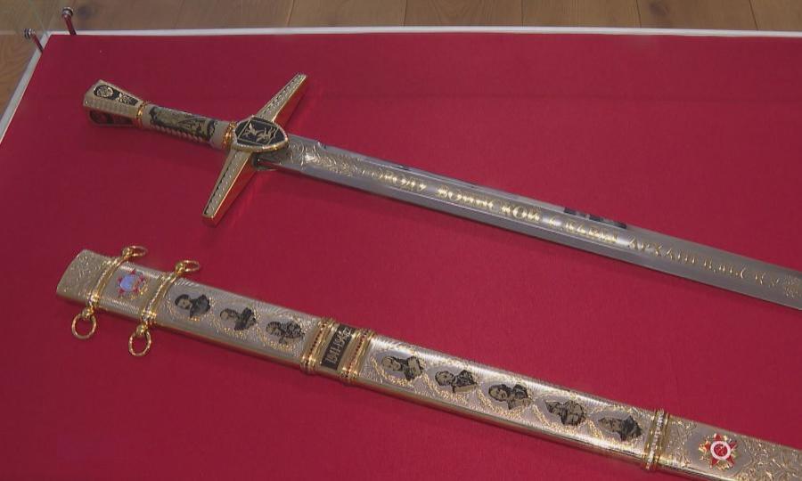— Сейчас после передачи мы закрываем эту витрину. Мы ставим ее под охрану, потому что меч — это не просто сувенир, там есть уральские самоцветы, есть топаз, есть гранат. Используется золото 999 пробы, поэтому все, что содержит драгоценные металлы — оно подлежит особому хранению.