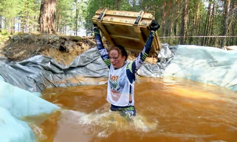 Градус экстрима добавило палящее солнце. Но у спортсменов была возможность освежиться. Это одиннадцатый этап и он называется "Кочки". Здесь около 70 покрышек и задача - в каждую покрышку встать ногой. Название этой преграды "Поцелуй грязи" звучит многообещающе. Участникам пришлось ползти в грязи под натянутой сеткой.