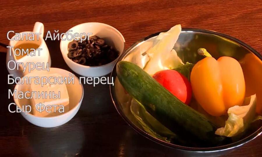 Салат "Айсберг": томат, огурец, болгарский перец, маслины, сыр Фета.