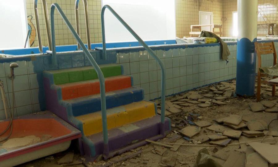 Так сейчас выглядит чаша бассейна в детском саду "Морошка". У дошколят это любимое место. Но пока здесь большой ремонт. Впереди установка вентиляции и укладка плитки. Ход работ оценил глава Архангельска Дмитрий Морев. А это бассейн детского сада "Туесок". Снять здесь советскую плитку со стен оказалась совсем не просто. Из-за этого работы немного замедлились. Но, как говорит подрядчик, в график укладываются. К ремонту строители приступили в середине июня.