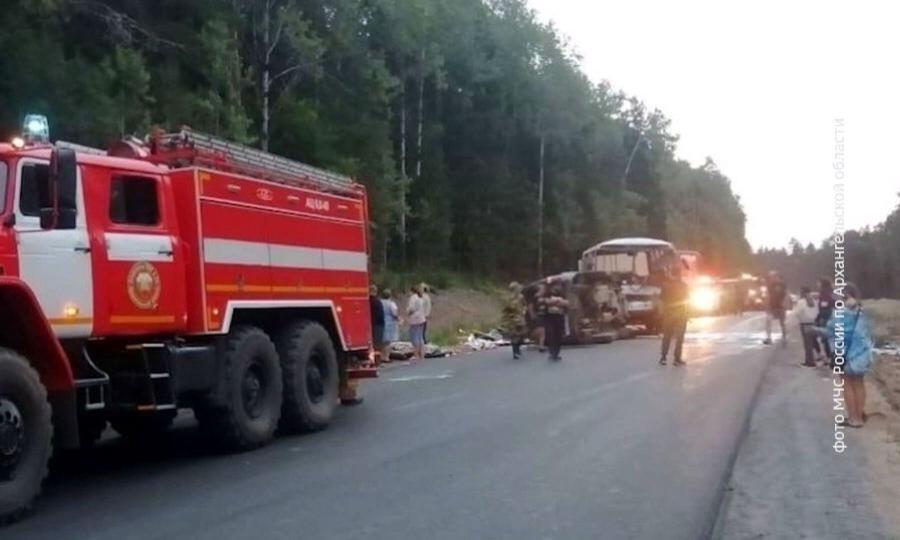 Авария произошла в минувшие выходные на 17 километре автодороги Онега - Тамица в районе села Покровское. По предварительной информации региональной полиции, водитель "УАЗ Патриот" вылетел на встречку, где столкнулся с автобусом, который перевозил работников дорожно-строительной организации. С травмами госпитализировали пять человек, среди них водитель "Патриота" и два пассажира. Водитель автобуса и пассажирка скончались.