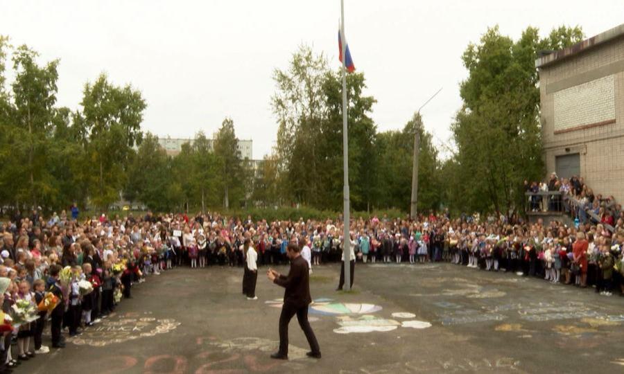 Отличникам выпала честь поднять государственный флаг России. В предъюбилейный год руководство школы пожелало ученикам и их родителям терпения и настойчивости. Первоклашки — в предвкушении.