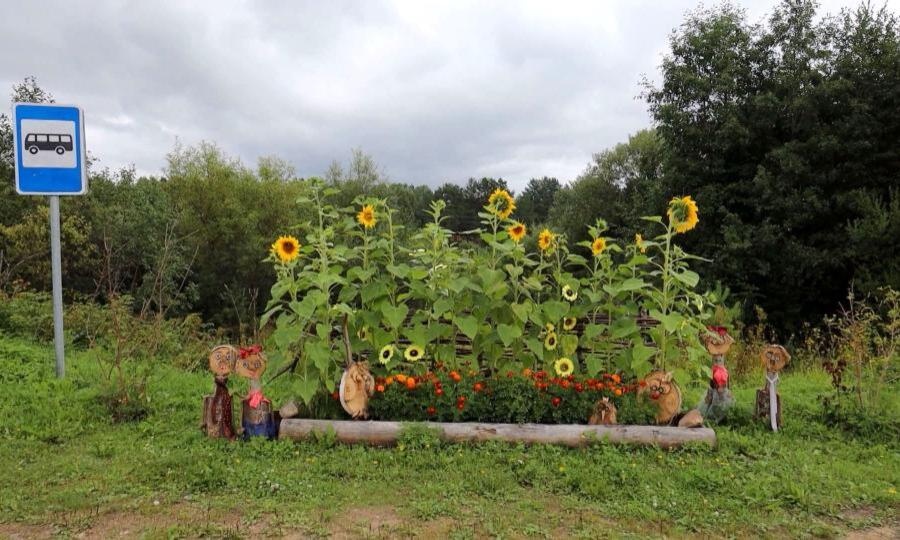 Автопавильон находится в деревне Дубровской. И раньше он ничем не отличался от других. Но местная активистка, председатель ТОСа Нина Дёмина взялась это исправить. Поставила скамейки, разбила клумбу с подсолнухами и смастерила из деревянных поленьев фигурки. Остановка стала центром притяжения для всех местных жителей.