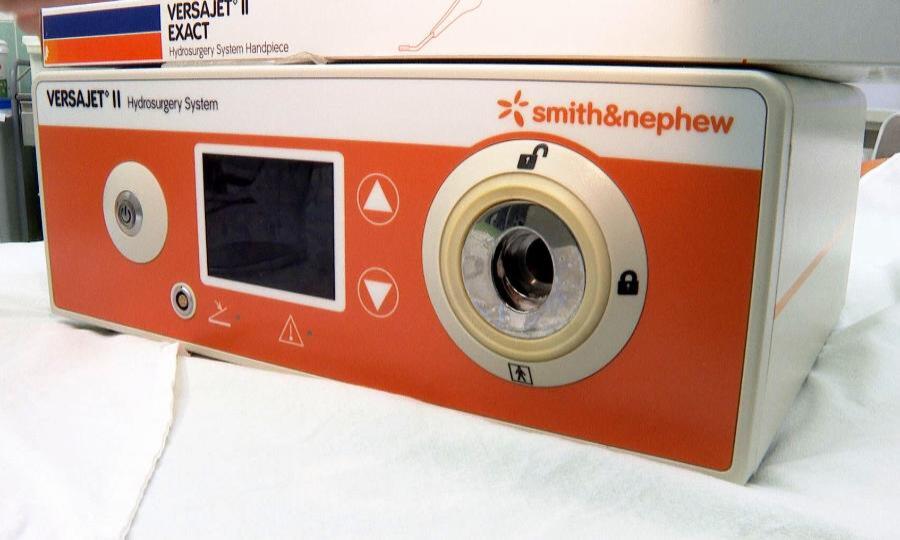 Ещё один аппарат, но уже импортного производства, стоимостью более 2 миллионов рублей — так называемый гидрохирургический скальпель. Струёй физраствора он бережно и быстро очищает рану во время операций. Раньше хирурги обрабатывали её вручную в течение получаса, а теперь это можно сделать за 5-10 минут.