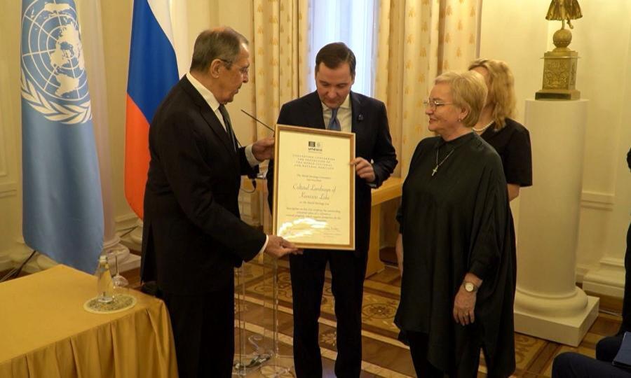 Долгожданный момент для всех сопричастных. Сергей Лавров вручает свидетельство о включении Кенозерского национального парка во Всемирное наследие ЮНЕСКО.