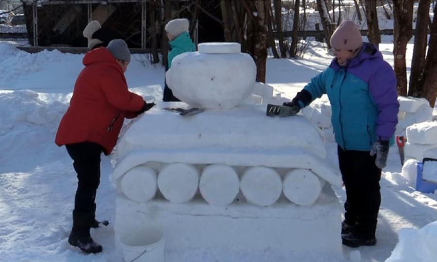 Снежный куб, как белый лист. Но бояться некогда. У команд только три часа, чтобы изваять скульптуру. Условия равные для всех. В ход пошли лопаты, пилы и скребки. А самые хрупкие детали пришлось лепить вручную. Снежный городок в устьянском селе Шангалы возводили уже в 16-й раз. Тема этого года — 80-летие Великой Победы. Жители посёлка Октябрьский трудились над созданием ангела-хранителя, а команда из деревни Юрятинской — над легендарным танком Т-34.