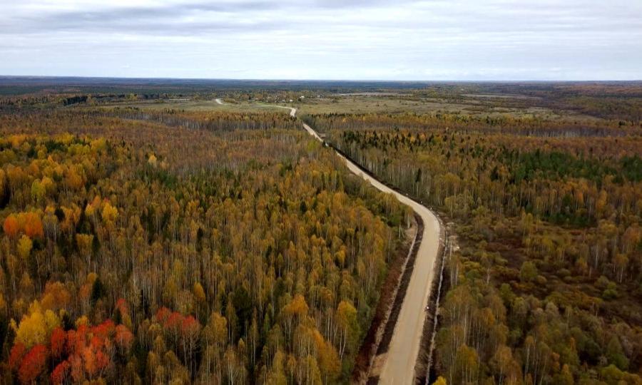 Этот участок длиной 16 километров дорожники приводили в порядок более полугода. Работа кипела днём и ночью. Здесь — болотистая местность, но благодаря качественному основанию полотно не разъедется под колёсами даже в дождь.