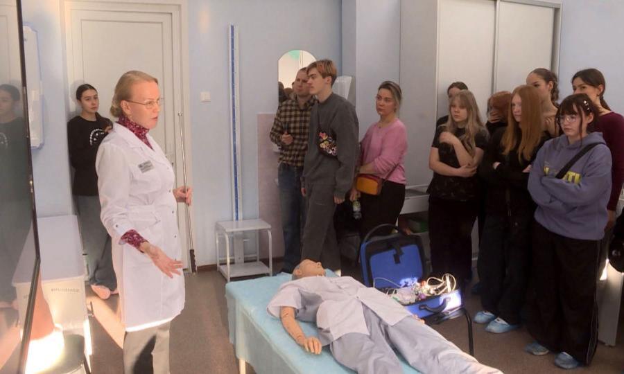 «Сейчас мы — в кабинете диагностической деятельности, именно здесь студенты учатся проводить обследования и ставить диагноз вот на таком манекене — они могут делать уколы, накладывать электроды, и, вообще, сегодня оборудование в Архангельском медицинском колледже — самое современное».