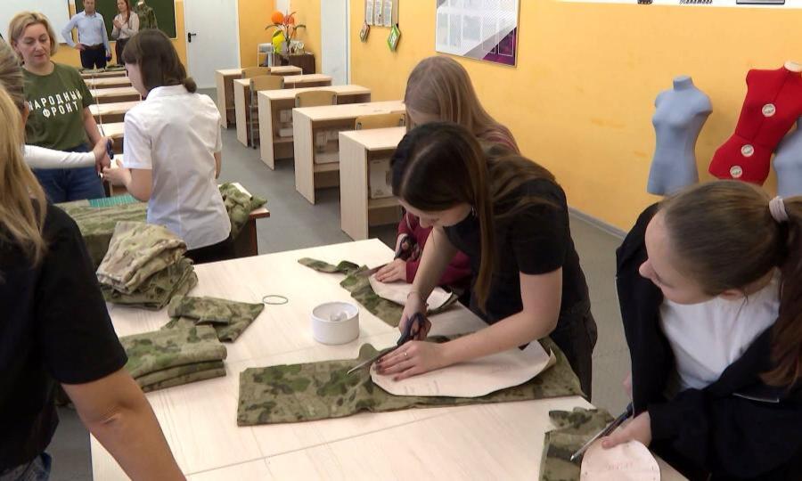 Вместо привычного фартука на манекене в кабинете технологии камуфляжный костюм. Школьницы будут шить одежду для бойцов СВО. В чём нуждаются на передовой — рассказывают участники добровольческого движения «Работаем, братья!». Их задача — приобщить подрастающее поколение к общему делу.