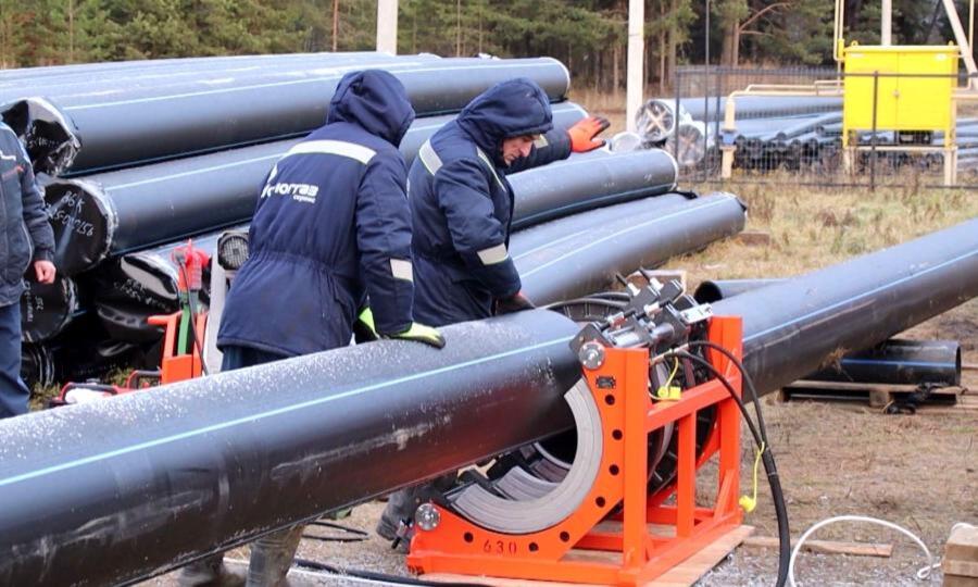 «Происходит стыковая сварка полиэтиленовых труб. В рамках этого проекта будет реализовано строительство водопровода протяжённостью 2,5 км., диаметр трубы — 450. То есть установка 30 водопроводных колодцев, 15 гидрантов».