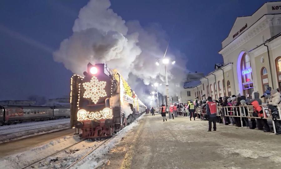 Мороз под 20 главный зимний волшебник будто сам и наколдовал. Но северяне стойко переносят испытания. Встречать сказочный состав выходят, пританцовывая. На станцию «Котлас-Южный» поезд прибыл без опозданий. Во главе — сияющий огнями паровоз П36, самый мощный из пассажирских.