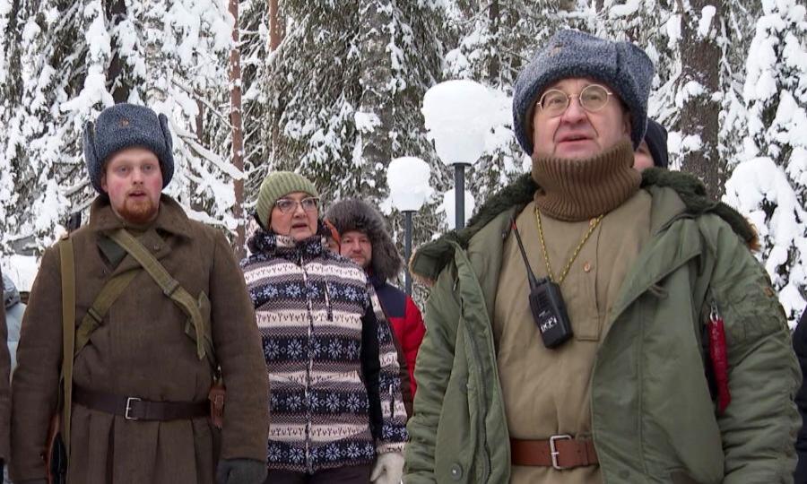 Участников программы «Защитники под крылом Архангела» уже на платформе встречают герои Юрьевского рубежа. Это место уникального и ещё не так давно почти забытого подвига. Мы стоим там, где в далёком 1919 решалась судьба независимости, быть может, целой России. Поэтому даже гимн звучит здесь особенно. Примерно так выглядели солдаты героического Юрьевского полка. Митинг среди огромных вековых елей, и сегодня трудно представить, что после боёв здесь была истерзанная снарядами земля, а лес полностью снесён артиллерией. Но 1300 русских солдат стояли насмерть, преграждая путь войскам Антанты.