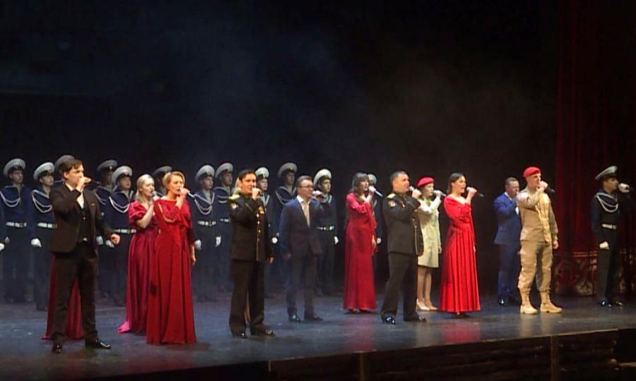 Зрительный зал сегодня особенный. Главные гости — военнослужащие, их семьи, а также волонтёры, которые день за днём собирают гуманитарные грузы. Первая часть концерта наполнена знакомыми композициями. Со сцены звучат патриотические песни и бессмертная классика военных лет.