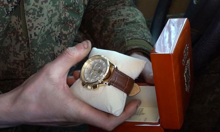 «Дорогой Станислав, выпала большая честь от имени губернатора Архангельской области Александра Витальевича Цыбульского накануне 23 февраля вручить этот ценный подарок — часы губернатора. Надеюсь они будут с вами и на передовой».