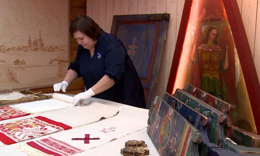 «Нам хотелось показать историю, культуру этих территорий во всей их красоте. Это такой сложный выбор. И плюс пока шла работа над выставкой, у нас появились несколько очень ценных предметов, например, дверь с Петром Блиновым. Это первая антропоморфная роспись в музейном фонде парка».