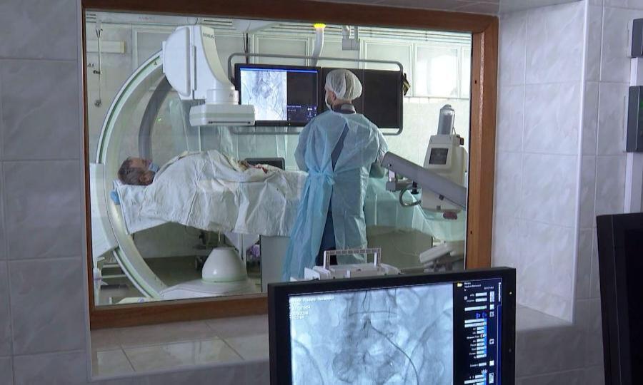 Проводят вмешательство в специальной рентген-операционной и под контролем УЗИ. Потому медикам нужна защита — свинцовый фартук, который весит около 10 килограммов. Хирурги через маленький прокол на шее - без скальпеля и разрезов - добираются к печени и устанавливают специальный стент так, чтобы кровь из вены, в которой большее давление, минуя печень, перетекла в полость сердца. Впервые такую операцию врачи Первой городской провели в 2024.