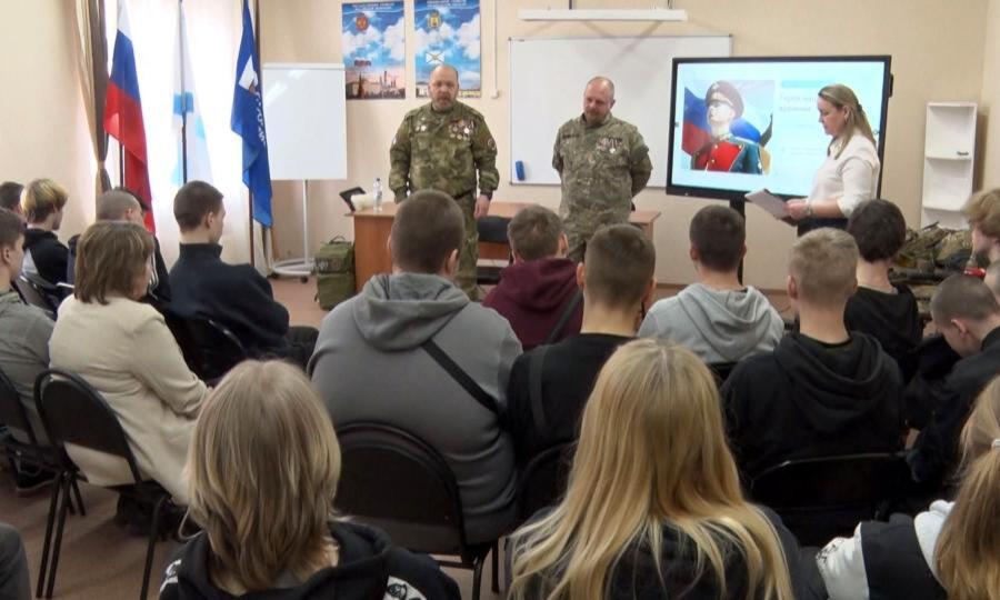 В гости к ребятам уже во второй раз пришёл слушатель региональной кадровой программы «Защитники. Под крылом Архангела» Руслан Жеглов. Ему есть, о чём рассказать. Был бойцом отряда спецназначения «Ратник», участвовал в военных действиях в Дагестане и Чечне, в 2024 г. ушёл на СВО. Урок мужества для первокурсников он провёл с другом детства и тоже участником СВО Игорем Перминовым.