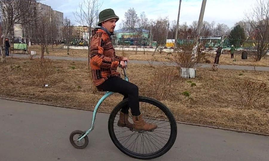 Сел и поехал. На высоте почти собственного роста! И это вовсе не цирковое представление! А уже привычный транспорт для Евгения Павозкова из Северодвинска. Пенни-фартинг. Именно такой двухколёсный, тот самый дедушка всех современных велосипедов. Популярен был в 19 столетии. У Евгения модель более усовершенствованная. Но не менее удивительная.